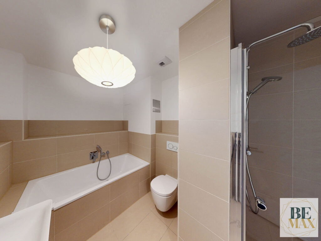 Die Bäder und WCs überzeugen mit großformatigen Fliesen sowie Einbauten und Armaturen namhafter Hersteller*innen. So sind bodenebene Duschen, Trennwände aus Glas oder flache Handtuchwärmer in allen Wohnungen Standard. Dies gilt auch für die hochwertige Einbauküche, die bereits mit elektrischen Markengeräten ausgestattet ist. Darüber hinaus bieten alle Wohnungen eine Fußbodenheizung, Sonnenmarkisen und in den Erdgeschossen elektrische Rollläden.