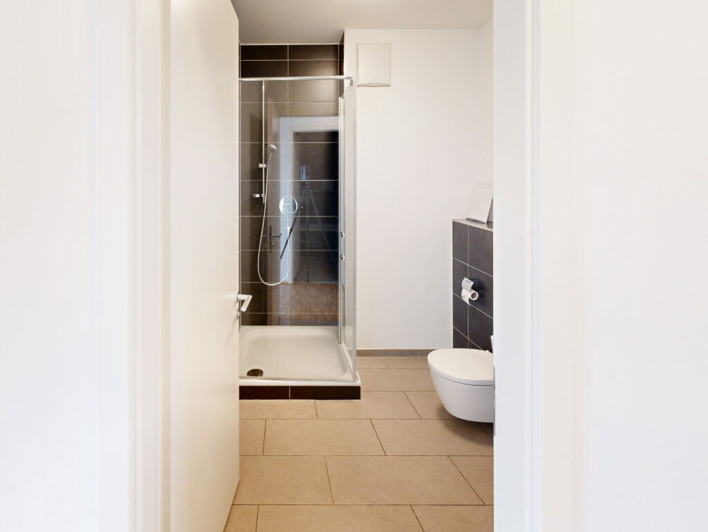 Auf der rechten Seite am Ende des Flurs liegt ein weiteres Badezimmer mit Dusche, direkt gegenüber ein praktischer Abstellraum.