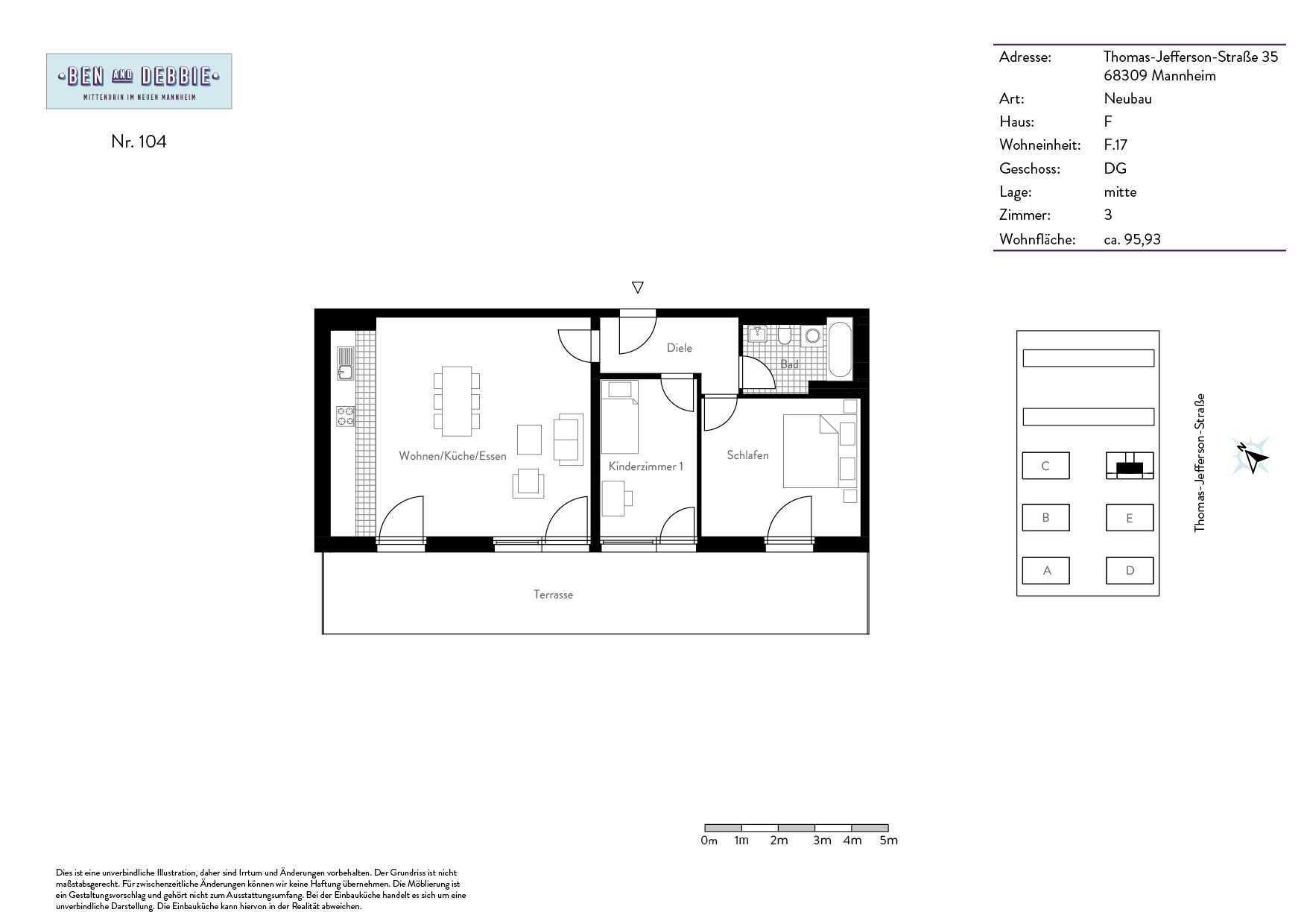 Die hier angebotene Penthousewohnung befindet sich im Ben & Debbie im neuen Stadtviertel Franklin. Die Wohnung verfügt über großzügige rund 96 Quadratmeter mit einem großen, offenen Wohn-, Ess- und Kochbereich. Über einen Flur erreichen Sie zudem die beiden Schlafräume als auch das moderne Wannenbad mit Waschmaschinenanschluss. Die großflächige, Richtung Südwesten ausgerichtete Dachterrasse ist über den Wohnbereich sowie die Schlafräume zugänglich und bietet Raum für gemeinsame Abende beim Genießen des Sonnenuntergangs. Ein weiteres Highlight der Wohnung stellt die große und moderne Einbauküche dar.