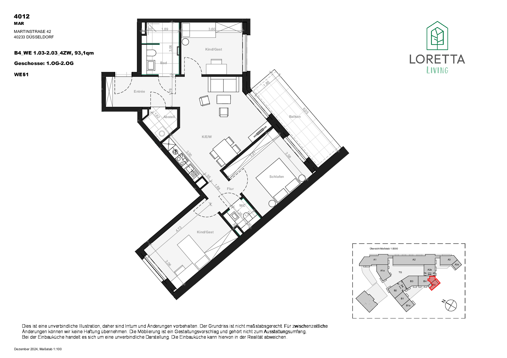Willkommen bei Loretta Living – einem modernen Wohnensemble in zentraler Lage von Düsseldorf, das urbanes Lebensgefühl mit naturnahem Wohnen verbindet. Das Gebäudeensemble bestehend aus einem fünf- und einem viergeschossigen Baukörper verkörpert modernes, komfortables Wohnen und bietet eine vielfältige Auswahl an durchdachten Grundrissen – ideal für Singles, Paare und Familien. Jede Wohnung überzeugt durch helle, offene Räume, Fußbodenheizung, eine moderne Einbauküche sowie Fenster mit Dreifachverglasung und erhöhtem Schallschutz. Besondere Highlights sind die privaten Außenbereiche: Alle Einheiten verfügen über einen Balkon, eine Loggia oder eine Terrasse mit Blick auf begrünte Innenhöfe – ideal zum Entspannen. Dank Aufzügen, stufenlosem Zugang und durchdachtem Design ist Loretta Living für jede Lebensphase geeignet.