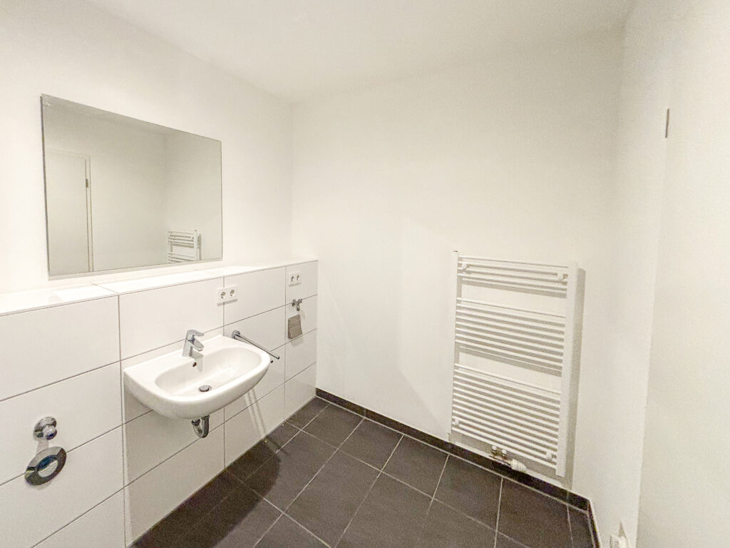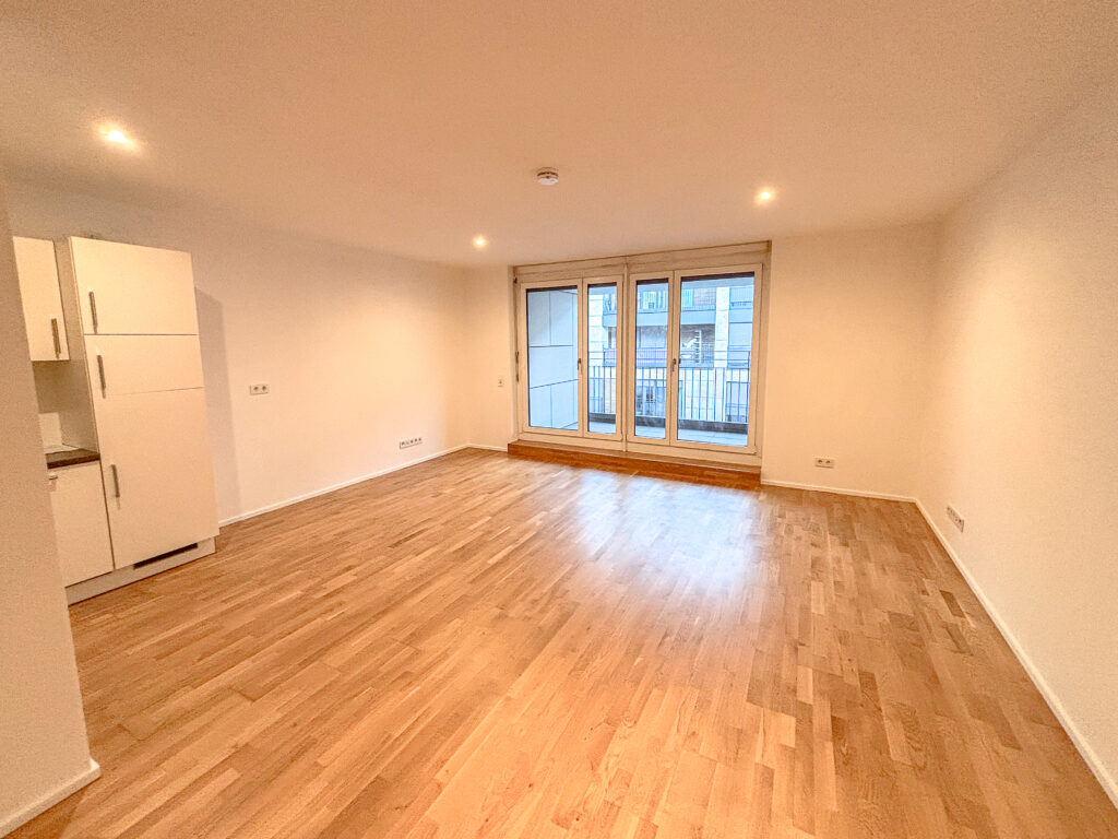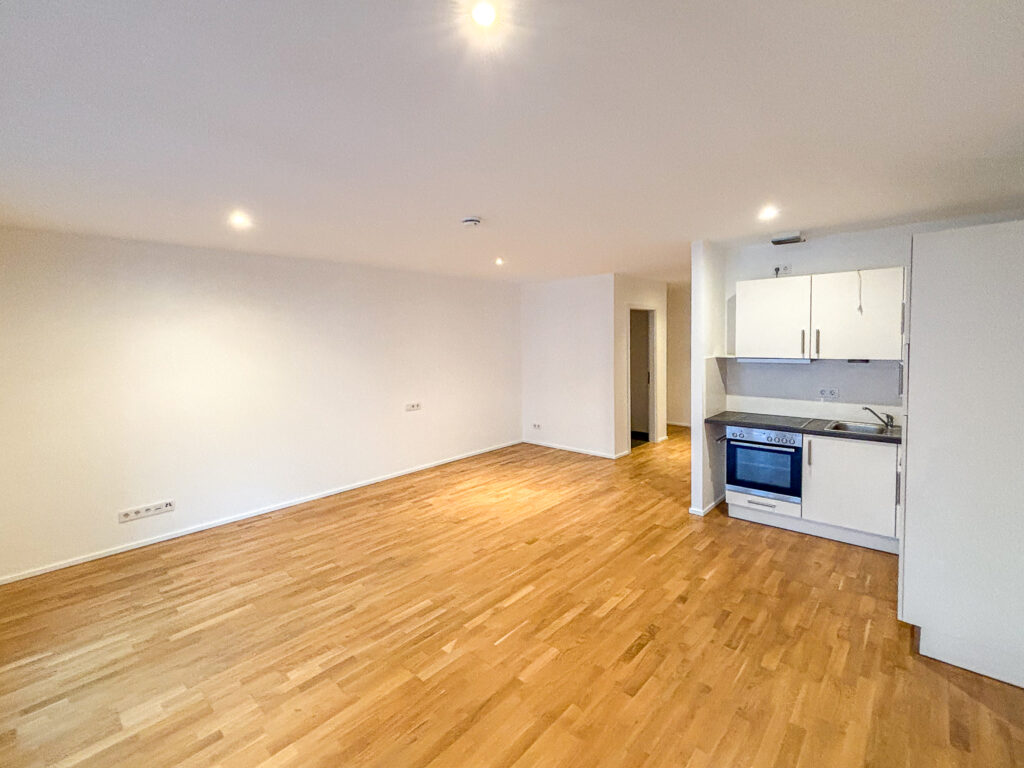 Toll geschnitten lädt das große Wohnzimmer mit integriertem Kochbereich und Loggia zum Relaxen ein. Ein schickes Badezimmer mit Dusche und Waschmaschinenanschluss komplettiert das 1-Zimmer-Apartment. Auch für einen Abstellraum ist gesorgt.