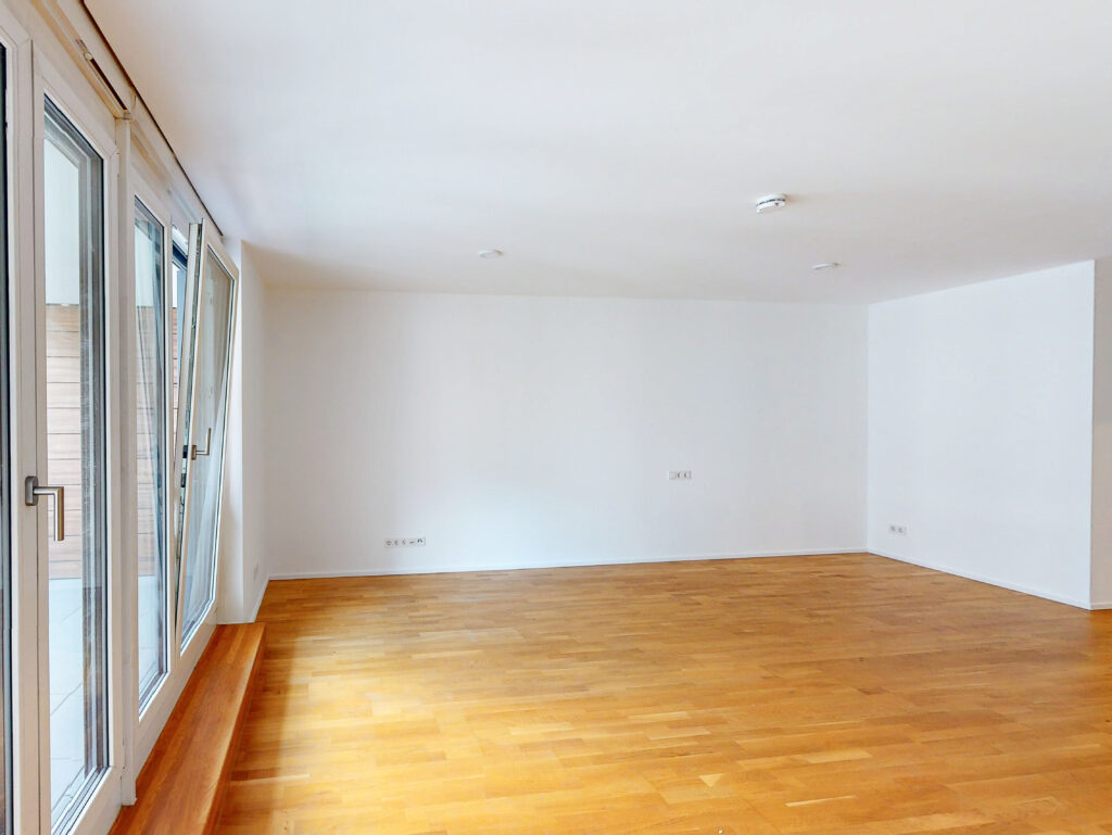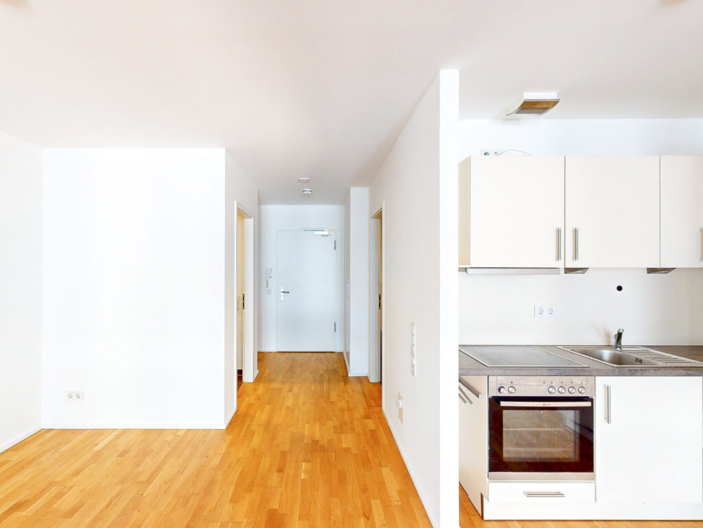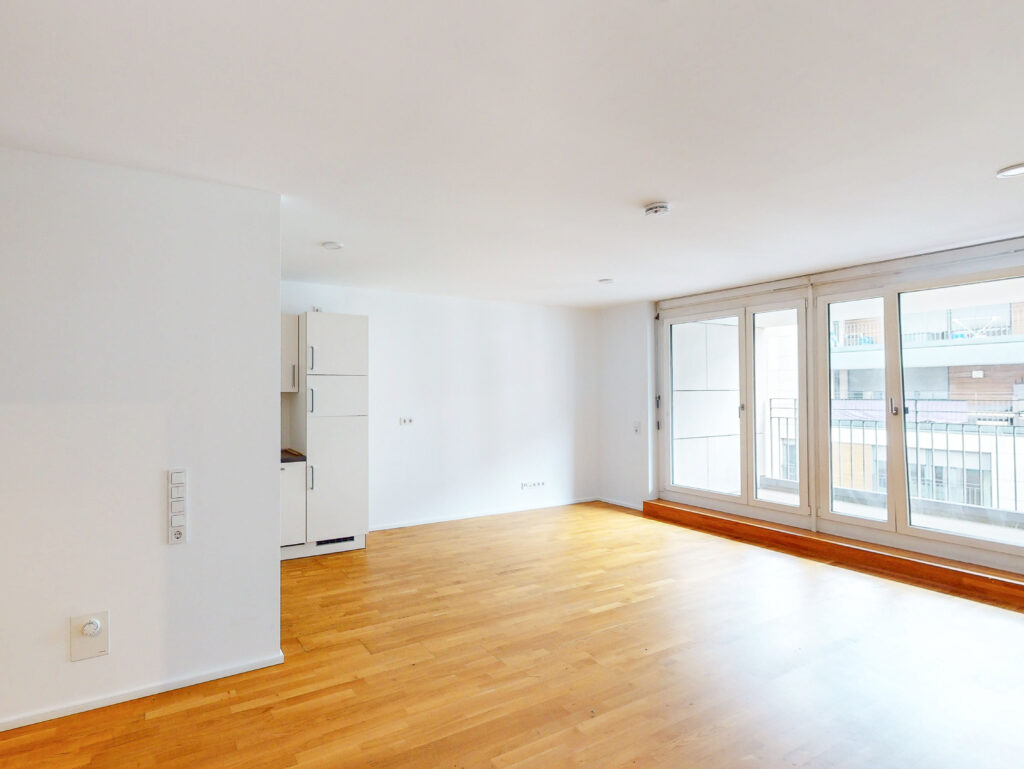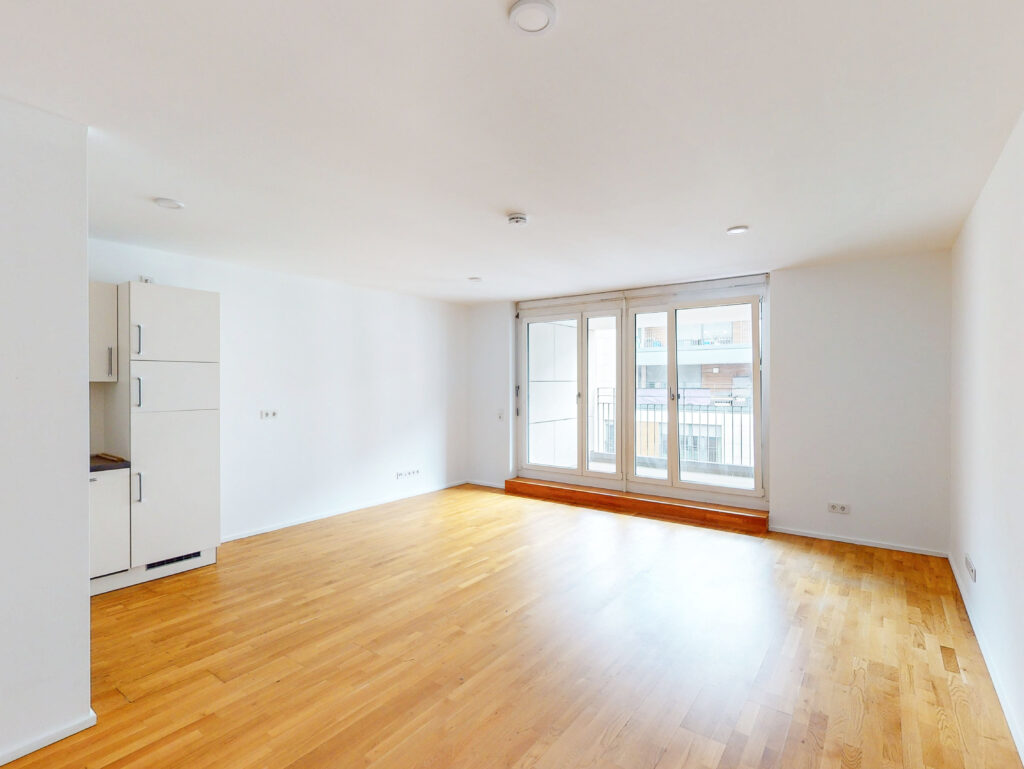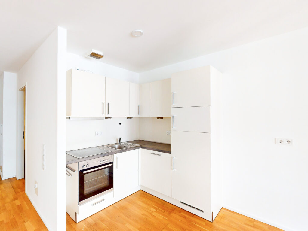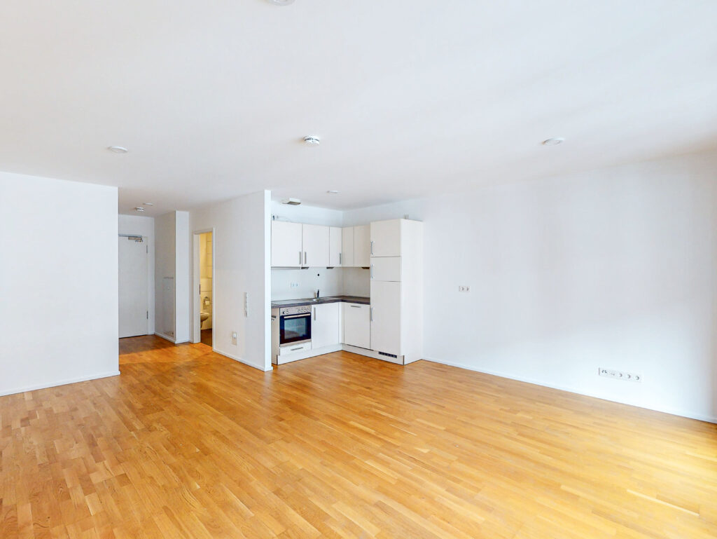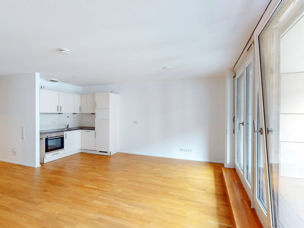 Toll geschnitten lädt das große Wohnzimmer mit integriertem Kochbereich und Loggia zum Relaxen ein. Ein schickes Badezimmer mit Dusche und Waschmaschinenanschluss komplettiert das 1-Zimmer-Apartment. Auch für einen Abstellraum ist gesorgt.