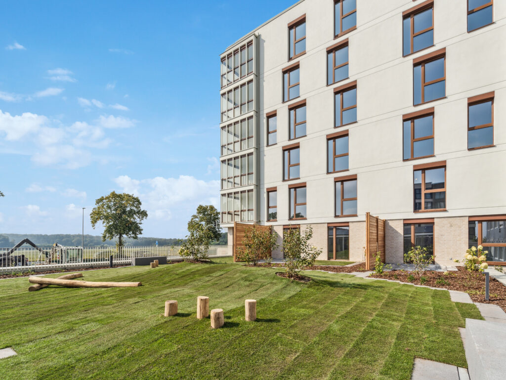 Als Teil des innovativen Neubaugebiets Steimker Gärten entsteht mit THE PLUS eines der modernsten Wohnprojekte Wolfsburgs. Hier wird nachhaltiges Wohnen großgeschrieben: Dank des KfW-40-plus Standards profitieren die Bewohner von einem um 60 % reduzierten Energiebedarf und damit geringeren Energiekosten, sowie höchsten Komfort in Sachen Wärmeversorgung und Belüftung. Das Ensemble wird in zwei Bauabschnitten errichtet. Im ersten Bauabschnitt entsteht ein moderner, sechsgeschossiger Neubau mit 36 Mietwohnungen. Die Tiefgarage mit 18 Stellplätzen bietet Platz für Autos, Fahrräder und zusätzliche Abstellräume. Der zweite Bauabschnitt umfasst weitere 152 Wohnungen. Architektonisch überzeugt THE PLUS mit klaren Linien und einem modernen Design. Hinter der hellen, einladenden Fassade verbirgt sich ein leistungsstarkes Wärmeverbundsystem, das für ein angenehmes Raumklima sorgt. Auch die Außenbereiche sind ein Highlight: Hier erwarten Sie gärtnerisch gestaltete Grünflächen, Hecken, Solitärbäume und gepflasterte Wege, die schattige Erholungszonen sowie einen Spielbereich für Kinder bieten – ein idealer Ort, um sich zu entspannen und wohlzufühlen.