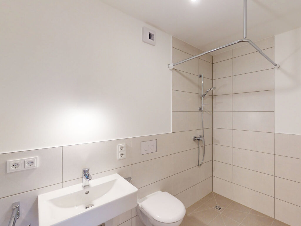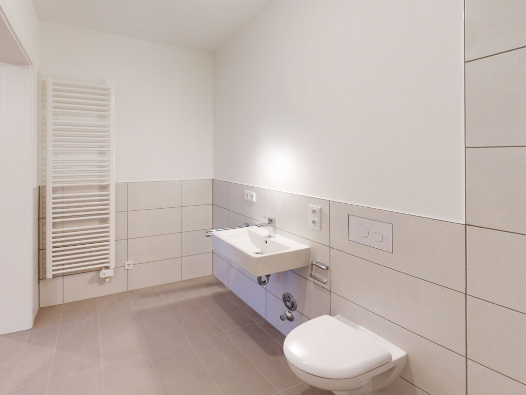 Diese helle und gut geschnittene 3-Zimmer-Wohnung überzeugt durch ihre klare Raumaufteilung und den praktischen Grundriss. Beim Betreten der Wohnung gelangen Sie in den zentralen Flur, von dem aus alle Räume erreichbar sind. Direkt gegenüber von der Eingangstür befindet sich ein separates WC, daneben das moderne Bad mit Dusche und Waschmaschinenanschluss.