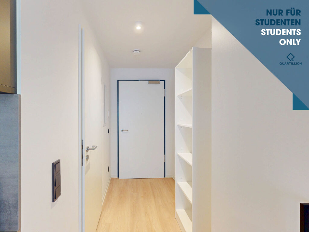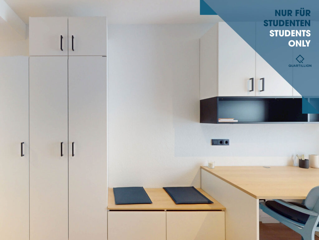 Im Quartillion erwartet dich modernes Wohnen im Herzen Wiesbadens: 182 zentral gelegene, hochwertig möblierte Einzelapartments bieten Studierenden den perfekten Mix aus Privatsphäre und Gemeinschaft. Dieses 1-Zimmer-Apartment überzeugt mit einer durchdachten Raumaufteilung und funktionalem Design. Der helle Wohn- und Schlafbereich verfügt über ein Bett, einen Schreibtisch, Stauraum sowie eine kompakte Pantryküche mit Spüle und Kochfeld. Das moderne Duschbad ist hochwertig ausgestattet. Dank der cleveren Möblierung nutzt du den Raum optimal – ideal zum Lernen, Entspannen und Wohlfühlen.