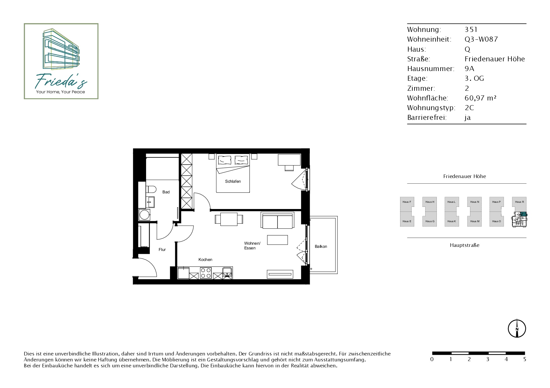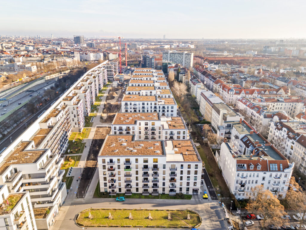 Mit dem FRIEDAS Berlin entsteht auf einem Areal von ca. 24.366 m2 ein modernes Wohnquartier. Der gesamte Neubau-Komplex in der Friedenauer Höhe umfasst sechs Gebäude mit insgesamt 396 Wohnungen, die in drei Bauabschnitten fertiggestellt werden. Im ersten Bauabschnitt entstehen 132 Wohnungen mit einem bis vier Zimmern, teilweise barrierefrei, sowie 69 TG-Stellplätze. Neben der Tiefgarage befinden sich im Untergeschoss auch Abstell-, Fahrrad-, Technik- und Müllräume sowie die Mieterkeller. Die moderne Architektur, bodentiefe Fenster und eine harmonische Farbgestaltung der Fassaden überzeugen ebenso wie die abwechslungsreich begrünten Außenanlagen. In Massivbaubauweise errichtet und erbaut gemäß den aktuell gültigen Bestimmungen der EnEV, erfüllen sämtliche Gebäude die Standards des GEG und „Effizienzhaus 55 EE“ sowie die Vorschriften des erhöhten Schallschutzes. Die Wärme- und Warmwasserversorgung sichert ein Blockheizkraftwerk. Die gärtnerische Gestaltung der Freiflächen umfasst Rasen und Pflanzbeete mit Stauden sowie Hecken, Sträucher und Kleingehölze. Die Abgrenzung der Erdgeschoss-Terrassen erfolgt ebenfalls durch Hecken. Ein Spielbereich für die Kleinsten mit Sandkasten und Spielgeräten wird ergänzt durch ebenerdige Spielflächen für Schach, Mühle oder Mensch-ärgere-dich-nicht.