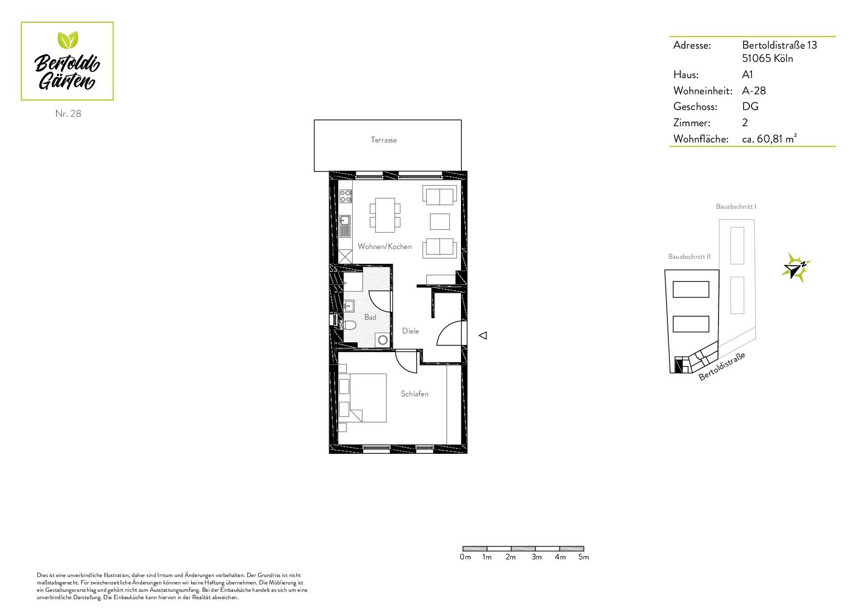 Die hier angebotene Dachgeschosswohnung ist Teil des Neubauprojektes Bertoldi Gärten, in Köln-Mülheim. Sie betreten die Wohnung über einen Flur, von dem aus Sie direkten Zugang zum Schlafzimmer, Duschbad sowie dem Wohn- und Essbereich mit offener Küche haben. Die Dachterrasse erreichen Sie über den Wohn- und Essbereich.
