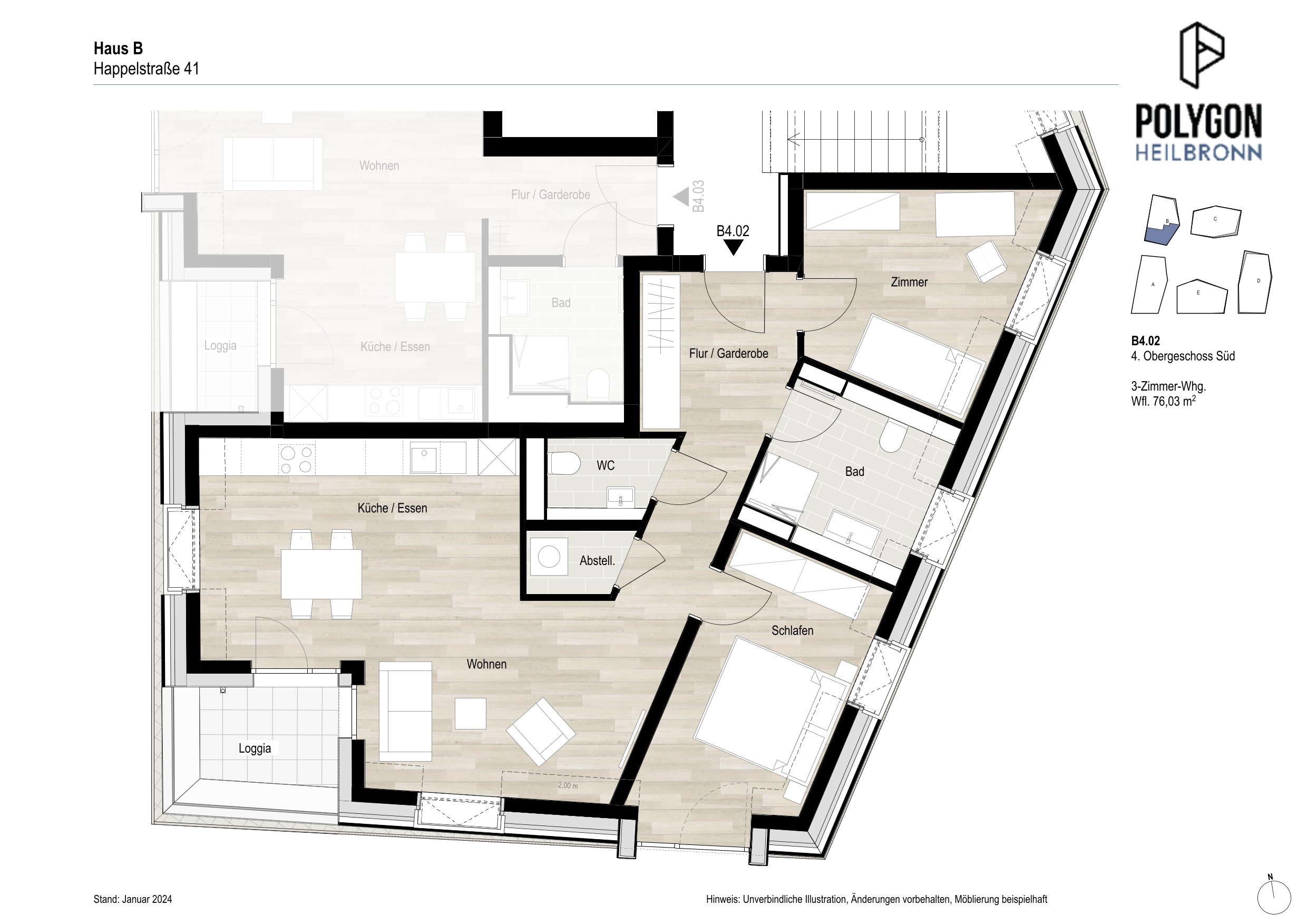 Das Wohnbauprojekt POLYGON umfasst den Neubau von fünf Mehrfamilienhäusern auf einem ca. 3.287 m2 großen Grundstück an der Happelstraße in Heilbronn. Auffallend sind die außergewöhnliche Architektur der Gebäude, deren polygonale Formen unterschiedliche Traufhöhen ergeben und spannende räumliche Situationen schaffen. Jede Gebäudeseite besticht mit einer individuellen Optik und Kubatur – und ohne die sonst übliche Einteilung der Fassaden in Vorder- und Rückseite. Ein zentraler begrünter Innenhof erschließt die Wohngebäude und die gemeinsame zweigeschossige Tiefgarage. Neben Anforderungen an ein KfW-Effizienzhaus 55 (GEG) erfüllen sämtliche Gebäude auch die Vorschriften des Schallschutzes und verfügen über eine effiziente Be- und Entlüftungstechnik. Sie werden nach den Standards der EnEV 2016 errichtet und erhalten wärmegedämmte Außenwände sowie eine Dachbegrünung. Insgesamt entstehen im POLYGON 69 freifinanzierte und 20 geförderte Wohneinheiten sowie 92 Stellplätze in der Tiefgarage. Der Wohnungsmix umfasst 1,5- bis 4-Zimmer-Wohnungen mit Wohnflächen von 35 bis 147 m2.