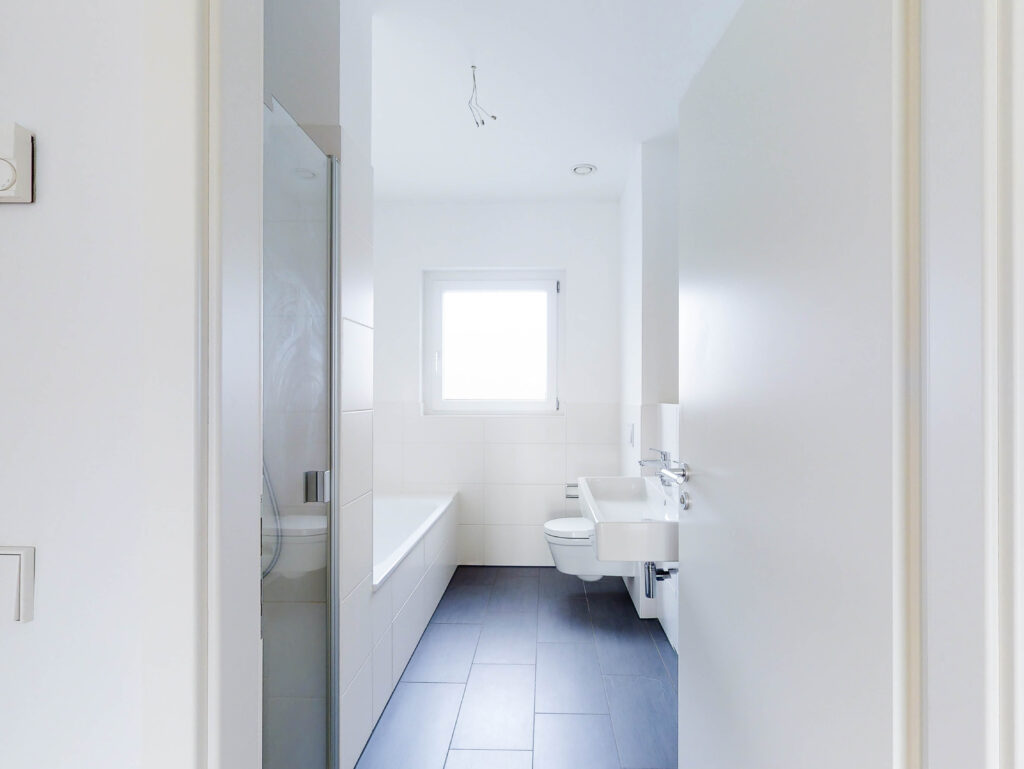 Die Wohnung verfügt über einen großzügigen Wohn- und Essbereich mit moderner Einbauküche, drei Schlafzimmer, ein Bad mit ebenerdiger Dusche und Badewanne sowie einen Flur mit Garderobe. Ein Gäste-WC rundet das Bild ab und ein Abstellraum mit Waschmaschinenanschluss bietet zusätzlichen Stauraum. Der Balkon in den Innenhof ist von einem der Schlafzimmer aus betretbar.