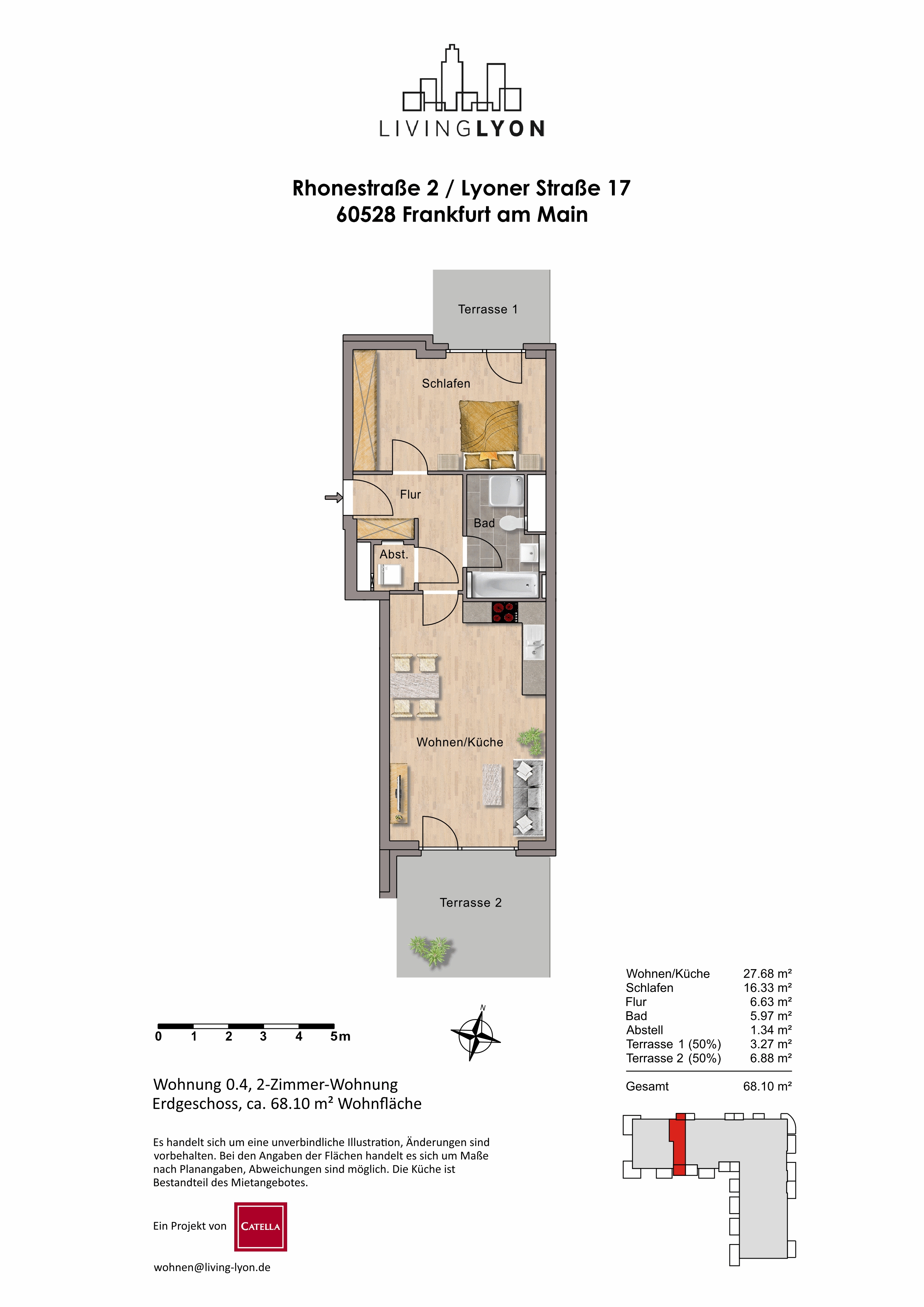Die Wohnung verfügt über einen großzügigen Wohn- und Essbereich mit L-förmiger Küche sowie ein geräumiges Schlafzimmer. Ein Duschbad, kurzer Flur und ein Abstellraum mit Waschmaschinenanschluss runden das Gesamtbild ab. Das besondere sind zwei Terrassen, die an den Wohnbereich bzw. das Schlafzimmer anschließen.