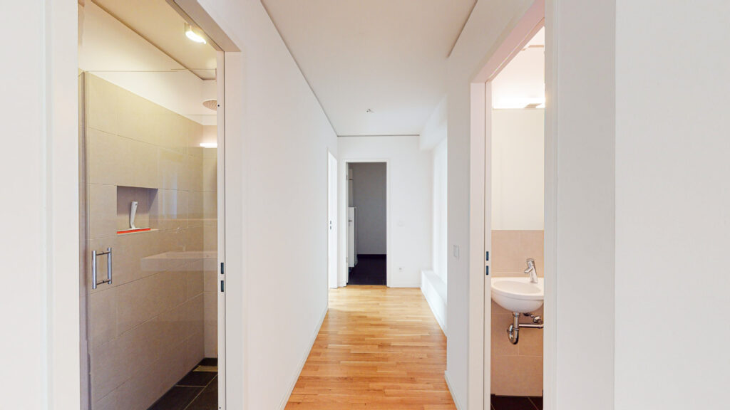 Alle Wohnräume sind mit Echtholzparkett ausgestattet und verfügen über Innenjalousien. In den Bädern und dem Hauswirtschaftsraum sind Steinfliesen vorzufinden. Die Beheizung der Wohnung erfolgt über eine Fußbodenheizung. Weiterhin kann ein Tiefgaragenstellplatz angemietet werden.
