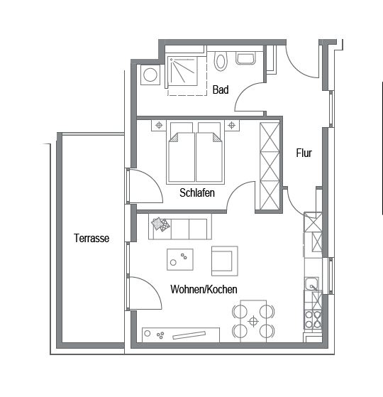 Die hier angebotene 2-Zimmer-Wohnung verfügt über ein Schlafzimmer sowie einen großzügigen Wohn- und Essbereich, mit einer offenen Küche (inkl. Einbauküche). Das moderne Duschbad (inkl. Waschmaschinenanschluss), ist über den Flur erreichbar. Die vom Wohnzimmer und eines der Schlafzimmer aus begehbare Terrasse lädt zum Verweilen ein.