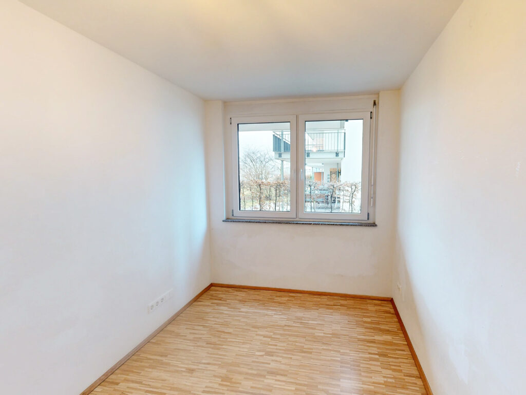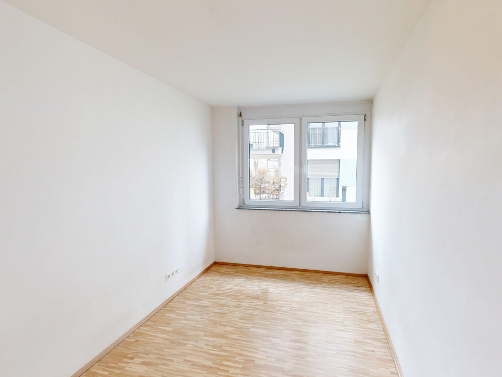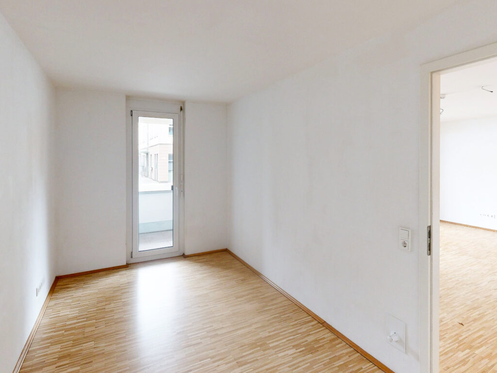 Geradeaus öffnet sich der Flur in den großzügigen, lichtdurchfluteten Wohn- und Essbereich mit Einbauküche. Von hier aus gelangen Sie direkt auf den Balkon. Links vom Wohnzimmer befindet sich ein weiteres Zimmer, das sich ideal als Büro, Gäste- oder Kinderzimmer eignet.