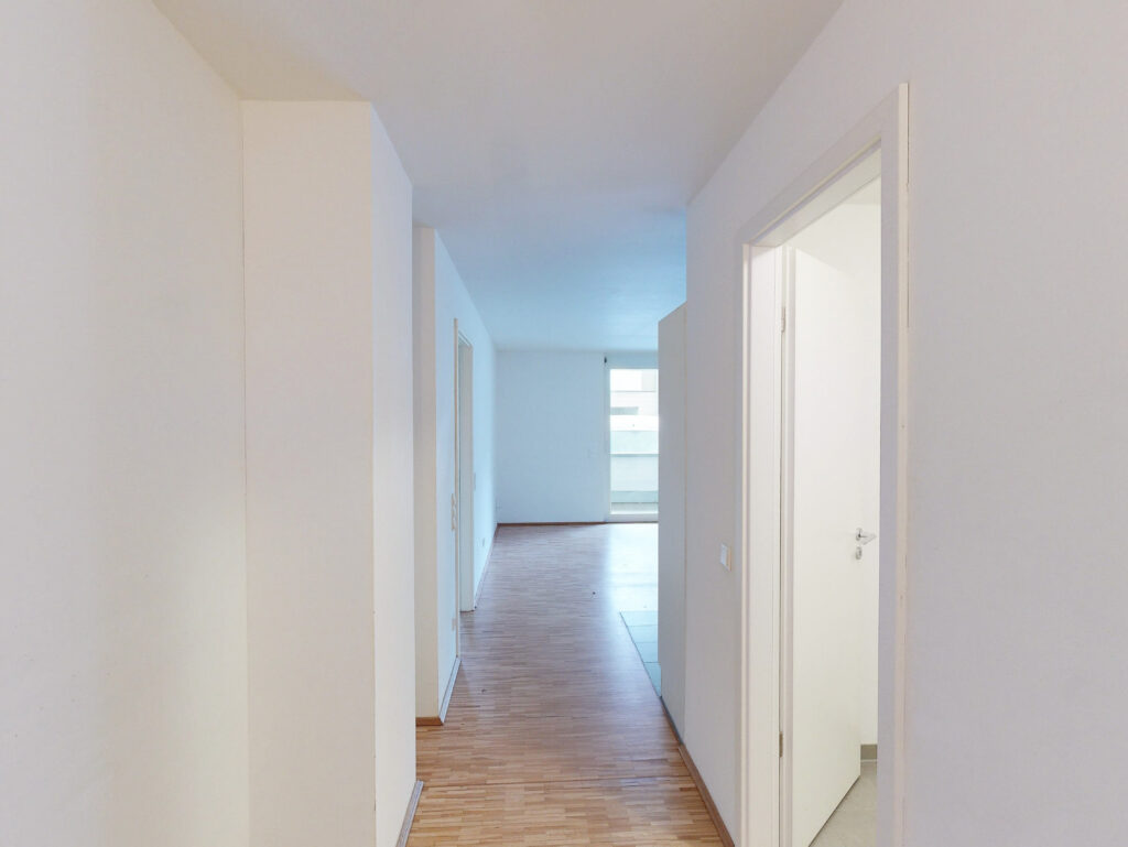 Beim Betreten der Wohnung gelangen Sie in einen langen, einladenden Flur. Gleich zu Beginn befindet sich auf der rechten Seite ein Gäste-WC mit Dusche. Gegenüber liegt ein geräumiges Schlafzimmer. Im weiteren Verlauf des Flurs erschließen sich zwei weitere gut geschnittene Schlafzimmer. Das Zimmer am Ende des Flurs bietet einen besonderen Komfort: Es verfügt über einen direkten Zugang zur Terrasse sowie über ein eigenes Badezimmer mit Badewanne und Waschmaschinenanschluss.