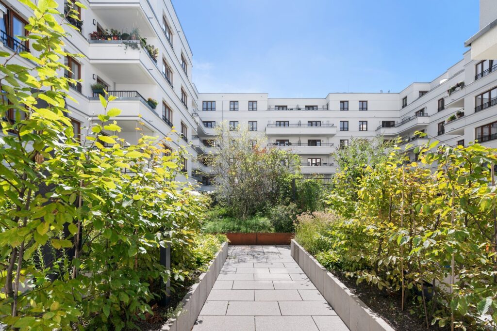Der private Innenhof und die Piazza sorgen durch ihre aufwändig gestalteten Grün- und Spielflächen für eine entspannte Atmosphäre, die zum Verweilen einlädt.