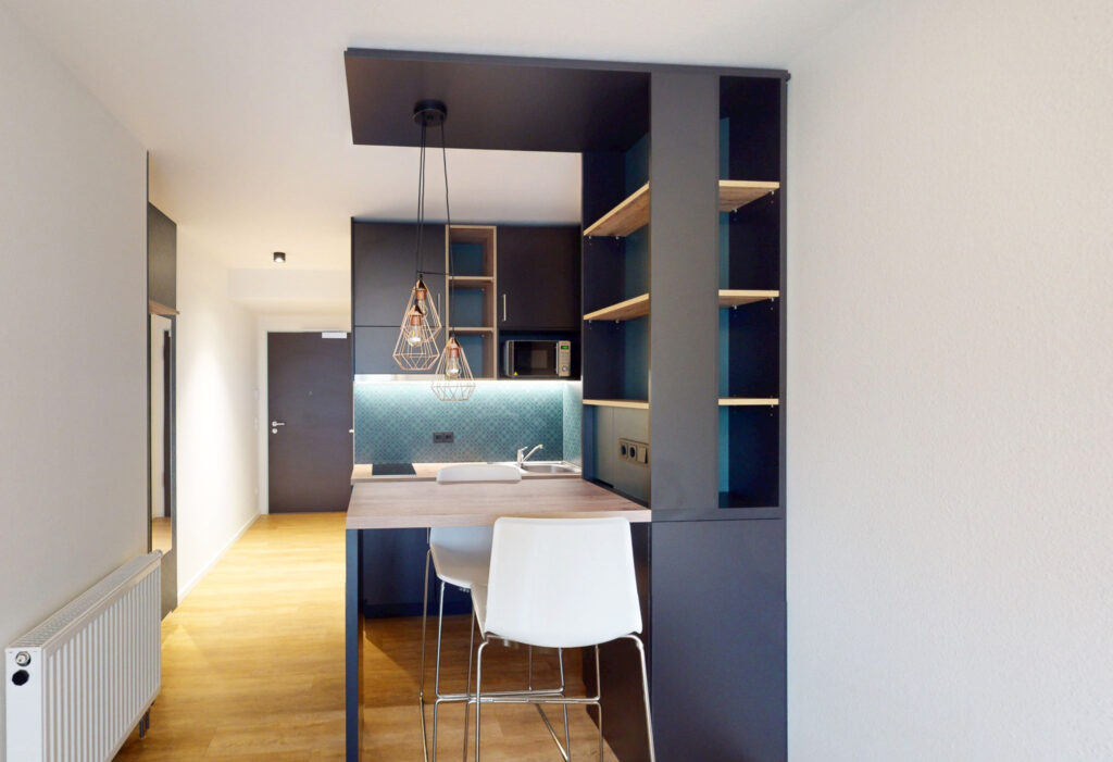 Die integrierte Kitchenette ist funktional ausgestattet und harmonisch in den Wohnraum eingebunden. Das moderne Bad ergänzt die hochwertige Ausstattung. WLAN- und TV-Anschluss sind vorhanden, die Einheit ist bezugsfertig.