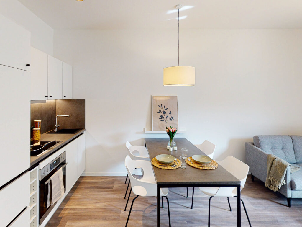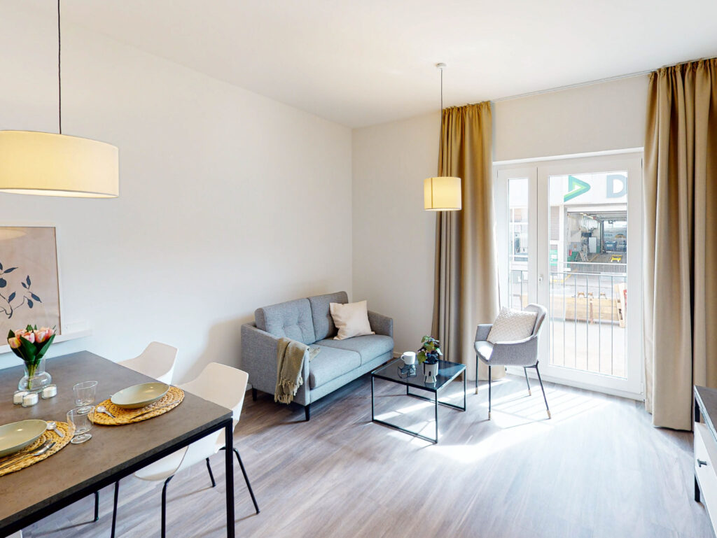 Neben einer unmöblierten 3-Zimmer-Wohnung sind es vor allem die möblierten 1-, 1,5- und 2-Zimmer-Apartments mit Wohnflächen von 37 bis 60 m², die sowohl Mietern mit temporären als auch langfristigen Wohnbedürfnissen eine Heimat bieten und den wachsenden Markt für Single-Haushalte bereichern.