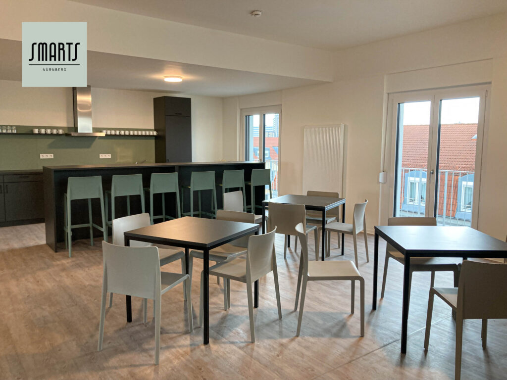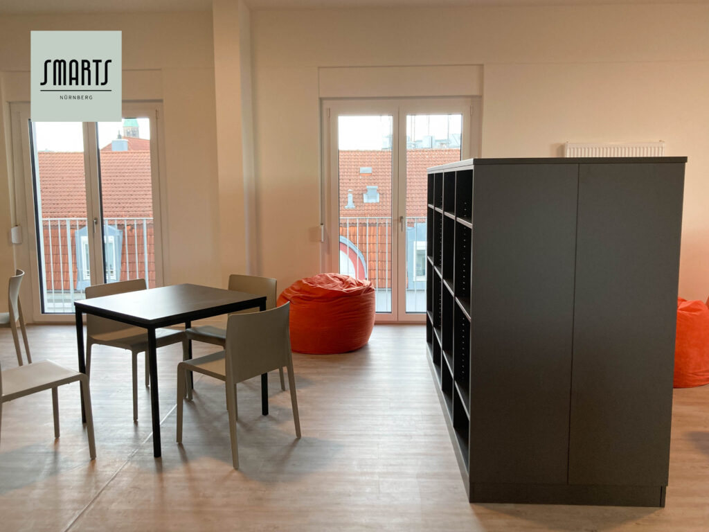 Das moderne Mikroapartment ist Teil der Apartmentanlage "SMARTS Nürnberg". Über 7 Stockwerke verteilt befinden sich 459 möblierte Apartments. Aufgrund der modernen Ausstattung und Möblierung können die neuen Bewohner des SMARTS Nürnberg unkompliziert mit dem Koffer einziehen. Wer Lust hat gleichgesinnte Mitbewohner zu treffen kann hierfür die Gemeinschaftslounge mit Zugang zur Dachterrasse nutzen. Zudem steht den Bewohnern ein Waschraum mit Waschmaschinen und Trocknern (kostenpflichtig) zur Verfügung.