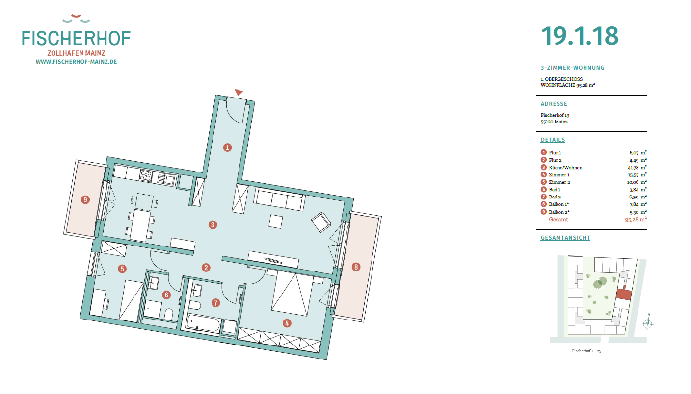 Insgesamt entstehen im Fischerhof 88 Wohnungen, sowie eine Tiefgarage mit 72 PKW-Stellplätzen. Der begrünte Innenhof bietet Sitzflächen und dient als Begegnungsort der Wohnanlage.