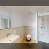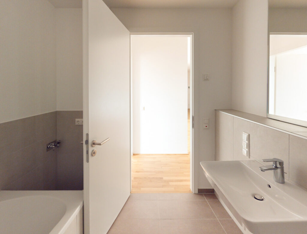 Die inserierte Wohnung verfügt über zwei Schlafzimmer sowie einen Wohn- und Essbereich mit offener Küche. Neben dem modernen Badezimmer mit Badewanne und einem Platz für die Waschmaschine, verfügt die Wohnung zusätzlich über ein Duschbad. Zwei Balkone bieten einen malerischen Blick auf die Grachten des Fischerhof sowie den begrünten Innenhof.