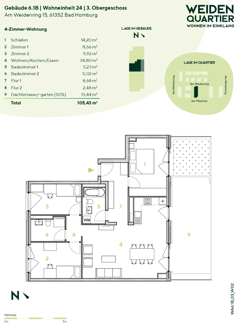 Die hier angebotene 4-Zimmer-Wohnung verfügt über drei Schlafzimmer sowie einen großen Wohn- und Essbereich mit einer L-förmigen Küche (inkl. Einbauküche). Über das Wohnzimmer gelangt man zur Dachterrasse. Die Wohnung ist mit einem Duschbad und einem Wannenbad mit Waschmaschinenanschluss ausgestattet.