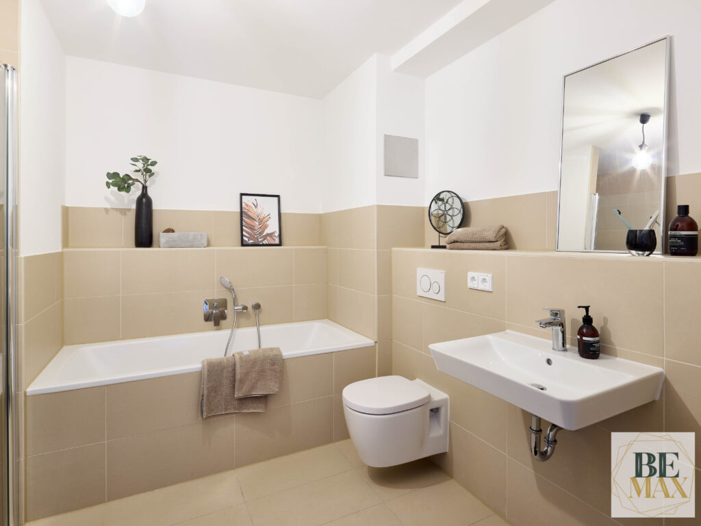 Die Bäder und WCs überzeugen mit großformatigen Fliesen sowie Einbauten und Armaturen namhafter Hersteller*innen. So sind bodenebene Duschen, Trennwände aus Glas oder flache Handtuchwärmer in allen Wohnungen Standard. Dies gilt auch für die hochwertige Einbauküche, die bereits mit elektrischen Markengeräten ausgestattet ist. Darüber hinaus bieten alle Wohnungen eine Fußbodenheizung, Sonnenmarkisen und in den Erdgeschossen elektrische Rollläden.