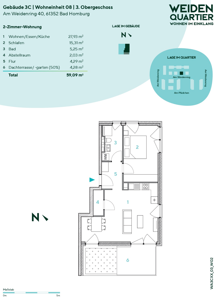 Die 2-Zimmer-Wohnung verfügt über ein Schlafzimmer sowie einen gemütlichen Wohn- und Essbereich, mit direktem Zugang zur Dachterrasse. Der Wohnbereich ist mit einer L-förmigen Küche sowie einem kleinen Abstellraum ausgestattet. Das moderne Duschbad mit Fenster befindet sich neben der Eingangstür.