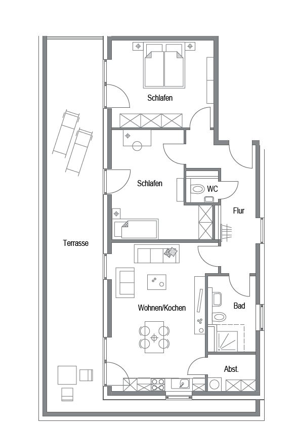 Die hier angebotene 3-Zimmer-Wohnung verfügt über zwei Schlafzimmer sowie einen großzügigen Wohn- und Essbereich, mit einer offenen Küche (inkl. Einbauküche). Das moderne Duschbad sowie das separate WC, sind über den Flur erreichbar. Die vom Wohnzimmer aus begehbare Dachterrasse lädt zum Verweilen ein. Ein separater Abstellraum rundet das Wohnungsangebot ab.
