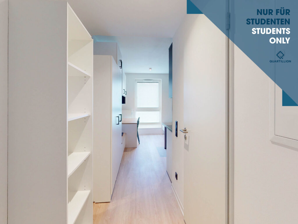 Im Quartillion erwartet dich modernes Wohnen im Herzen Wiesbadens: 182 zentral gelegene, hochwertig möblierte Einzelapartments bieten Studierenden den perfekten Mix aus Privatsphäre und Gemeinschaft. Dieses 1-Zimmer-Apartment überzeugt mit einer durchdachten Raumaufteilung und funktionalem Design. Der helle Wohn- und Schlafbereich verfügt über ein Bett, einen Schreibtisch, Stauraum sowie eine kompakte Pantryküche mit Spüle und Kochfeld. Das moderne Duschbad ist hochwertig ausgestattet. Dank der cleveren Möblierung nutzt du den Raum optimal – ideal zum Lernen, Entspannen und Wohlfühlen.
