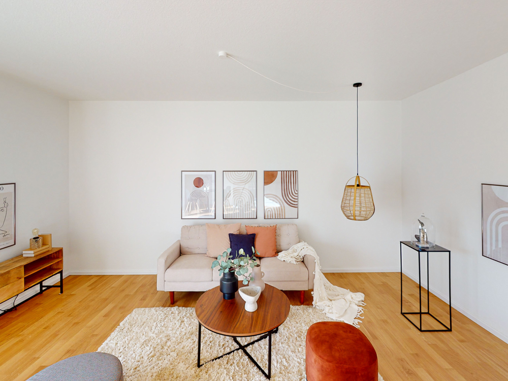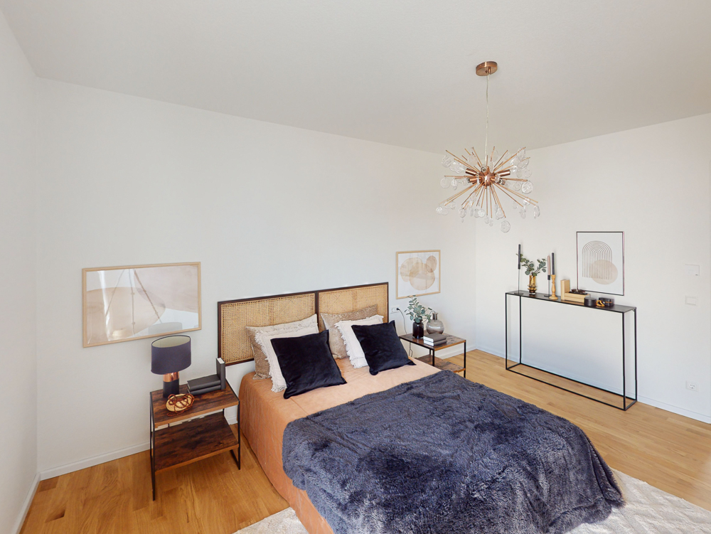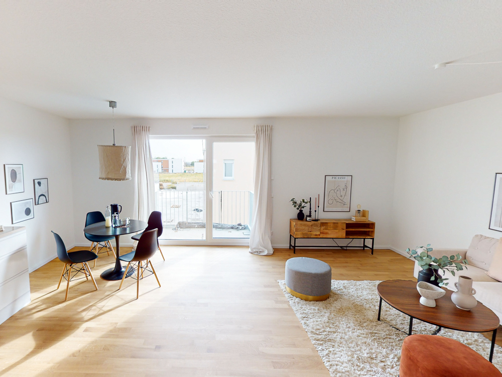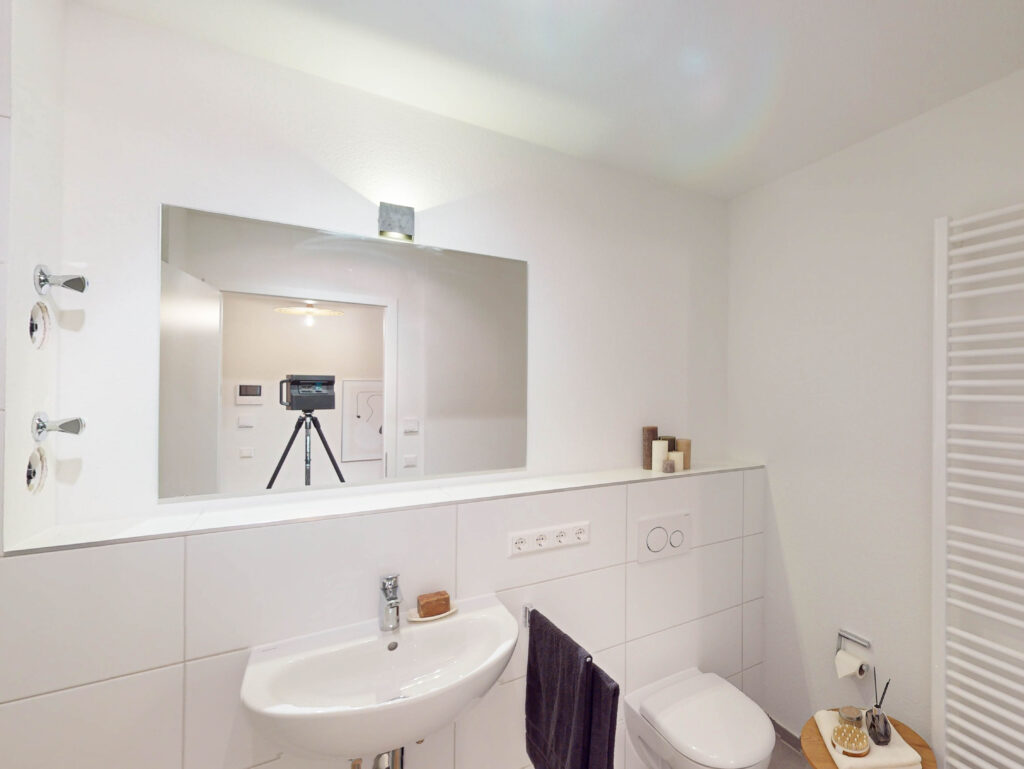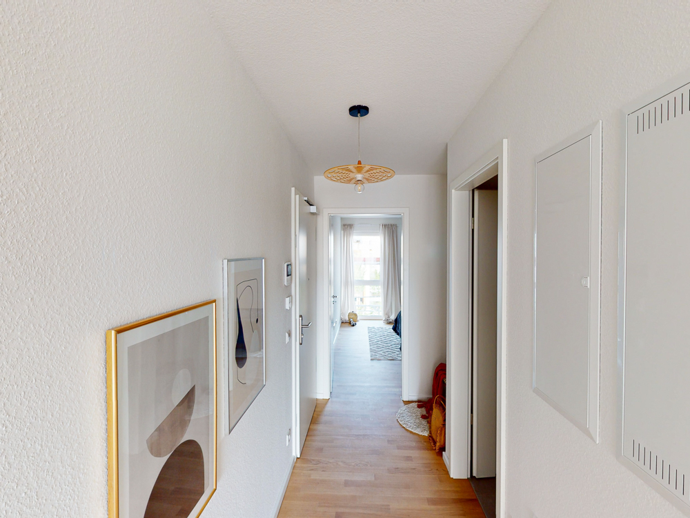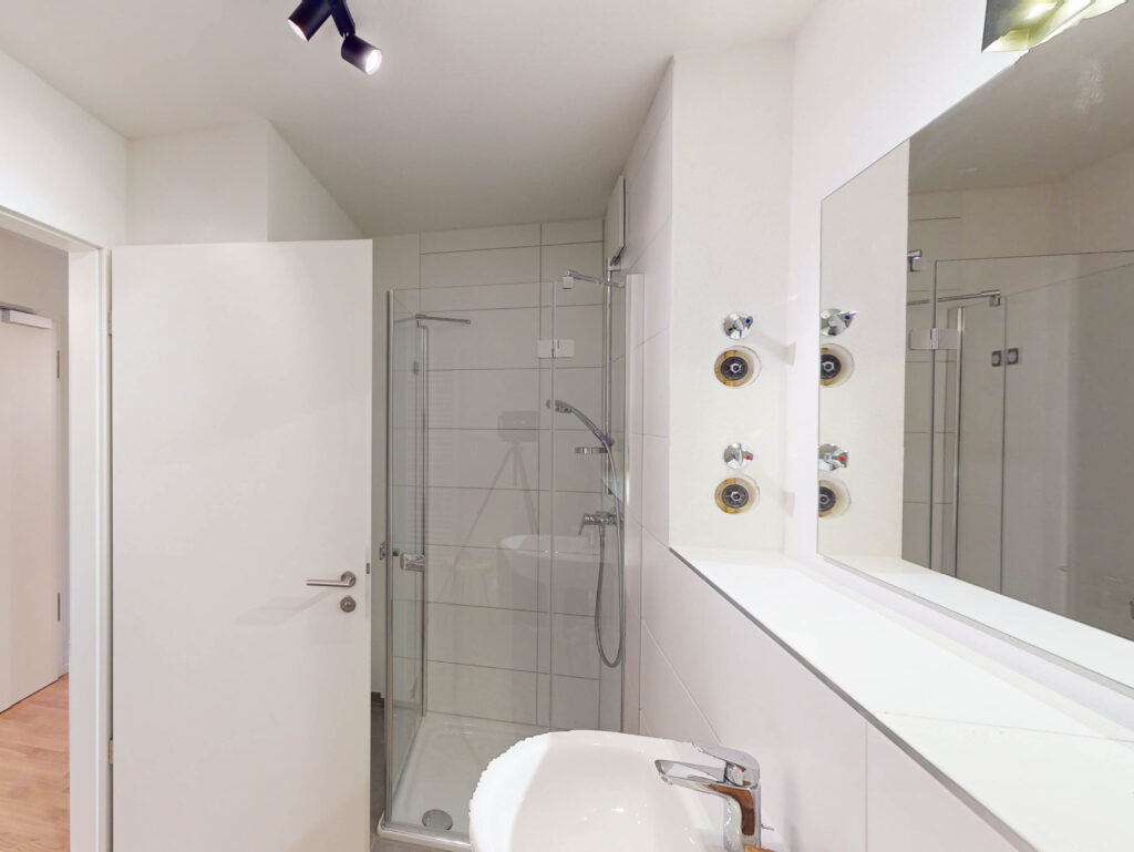 Beginnend mit einer kleinen Diele als Eingangsbereich gelangt man auf der rechten Seite direkt in das separate geräumige Schlafzimmer. Weiterhin verfügt die angebotene Wohnung über ein innenliegendes Badezimmer mit großer modernen Dusche inkl. Glastrennwänden. Der sich anschließende offene Wohnbereich bietet mit den bereits vorinstallierten Anschlüssen für eine Einbauküche viel Raum für verschiedene Einrichtungsideen. Ein eigener Waschmaschinenanschluss im gemeinsamen Waschraum sowie ein separates Kellerabteil befinden sich im Untergeschoss.