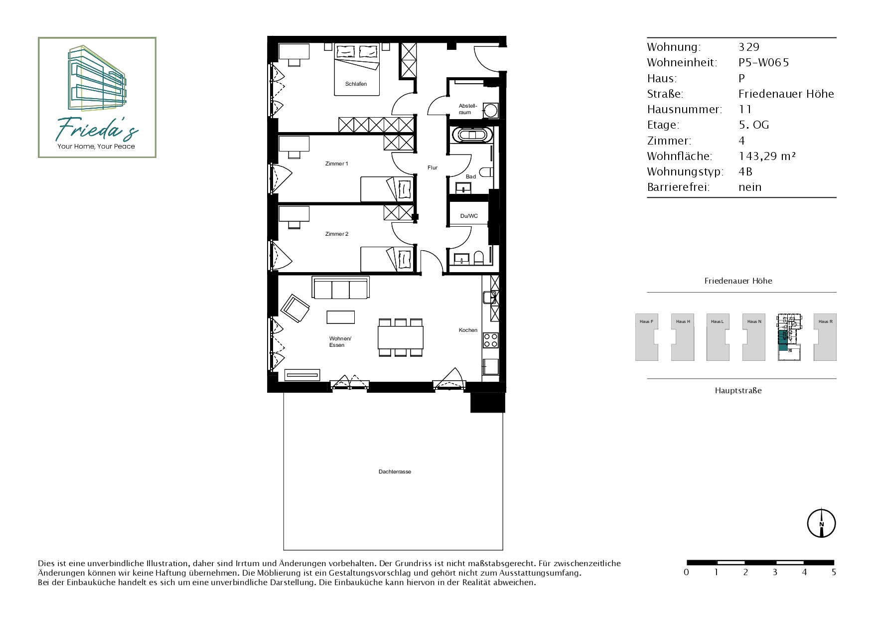 Mit dem FRIEDAS Berlin entsteht auf einem Areal von ca. 24.366 m2 ein modernes Wohnquartier. Der gesamte Neubau-Komplex in der Friedenauer Höhe umfasst sechs Gebäude mit insgesamt 396 Wohnungen, die in drei Bauabschnitten fertiggestellt werden. Im ersten Bauabschnitt entstehen 132 Wohnungen mit einem bis vier Zimmern, teilweise barrierefrei, sowie 69 TG-Stellplätze. Neben der Tiefgarage befinden sich im Untergeschoss auch Abstell-, Fahrrad-, Technik- und Müllräume sowie die Mieterkeller. Die moderne Architektur, bodentiefe Fenster und eine harmonische Farbgestaltung der Fassaden überzeugen ebenso wie die abwechslungsreich begrünten Außenanlagen. In Massivbaubauweise errichtet und erbaut gemäß den aktuell gültigen Bestimmungen der EnEV, erfüllen sämtliche Gebäude die Standards des GEG und „Effizienzhaus 55 EE“ sowie die Vorschriften des erhöhten Schallschutzes. Die Wärme- und Warmwasserversorgung sichert ein Blockheizkraftwerk. Die gärtnerische Gestaltung der Freiflächen umfasst Rasen und Pflanzbeete mit Stauden sowie Hecken, Sträucher und Kleingehölze. Die Abgrenzung der Erdgeschoss-Terrassen erfolgt ebenfalls durch Hecken. Ein Spielbereich für die Kleinsten mit Sandkasten und Spielgeräten wird ergänzt durch ebenerdige Spielflächen für Schach, Mühle oder Mensch-ärgere-dich-nicht.
