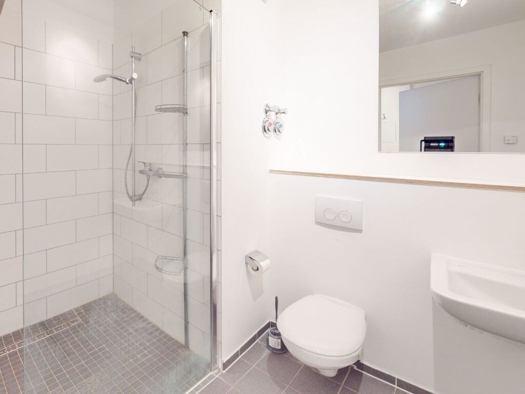 Der offene Grundriss schafft eine angenehme Wohnatmosphäre. Die vorhandene Möblierung – inkl. Bett, Tisch, Stühle und Beleuchtung – sorgt für einen schnellen und unkomplizierten Einzug. Ein modernes Duschbad mit ebenerdiger Dusche ist ebenfalls vorhanden.