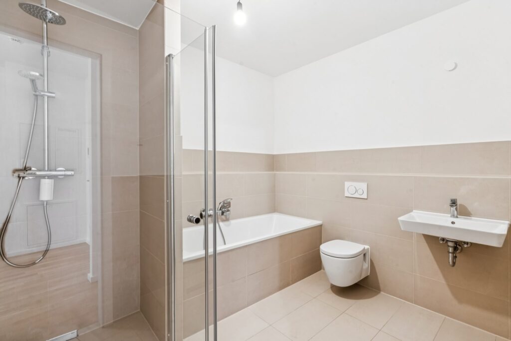 Die Bäder und WCs überzeugen mit großformatigen Fliesen sowie Einbauten und Armaturen namhafter Hersteller*innen. So sind bodenebene Duschen, Trennwände aus Glas oder flache Handtuchwärmer in allen Wohnungen Standard. Dies gilt auch für die hochwertige Einbauküche, die bereits mit elektrischen Markengeräten ausgestattet ist. Darüber hinaus bieten alle Wohnungen eine Fußbodenheizung, Sonnenmarkisen und in den Erdgeschossen elektrische Rollläden.