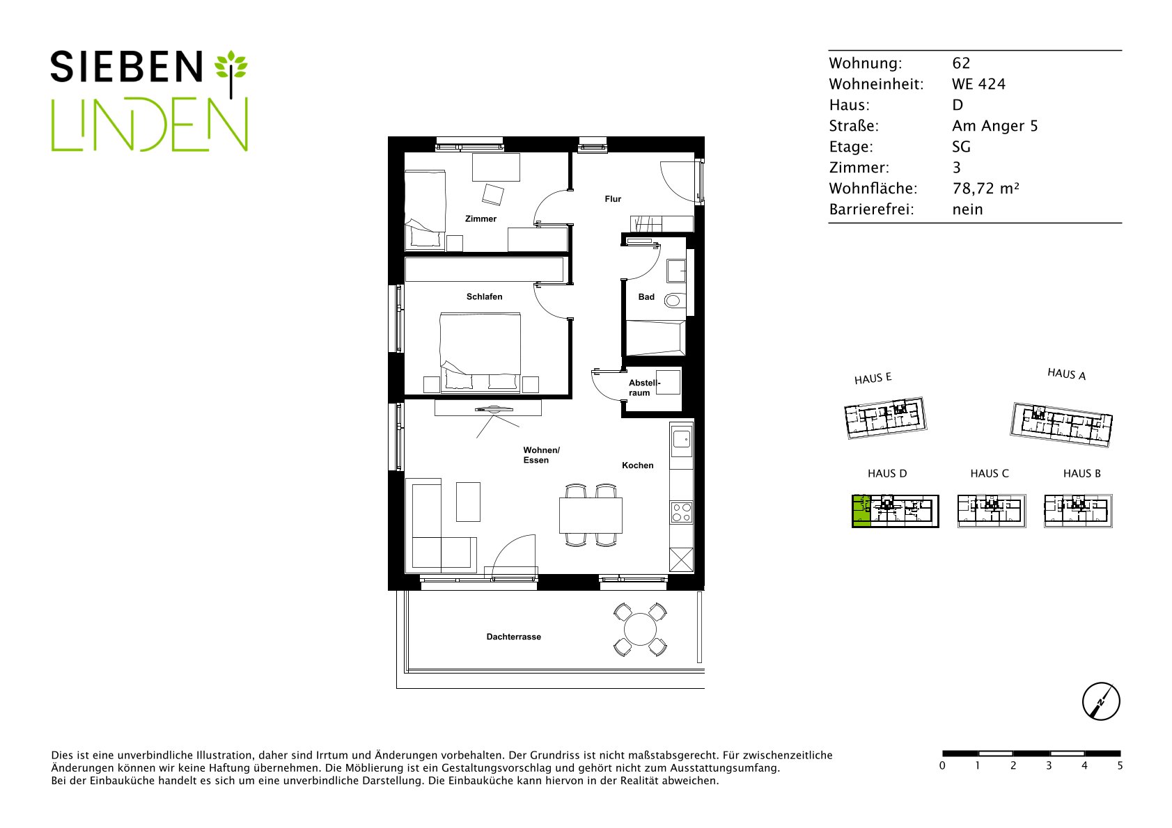 Bei 78 Quadratmetern finden Sie in den Sieben Linden eine 3-Zimmer-Wohnung, die zu Ihnen passt! Die inserierte Wohnung verfügt über zwei Schlafzimmer, einen Wohn- und Essbereich mit offener Küche, sowie einem Duschbad. Eine Abstellkammer bietet zusätzliche Staufläche. Eine großzügige Dachterrasse rundet das Wohnangebot ab.