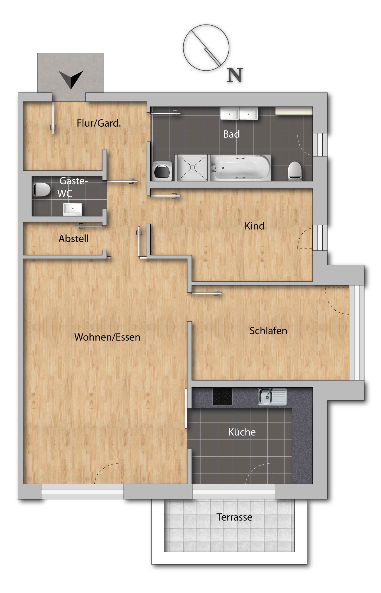 Die hier angebotene Wohnung besteht aus einem Badezimmer, einem Kinderzimmer, einem Schlafzimmer, einem Gäste-WC, einem Abstellraum, einem Wohnzimmer mit halboffener Küche. Die Terrasse erreicht man über die Küche.