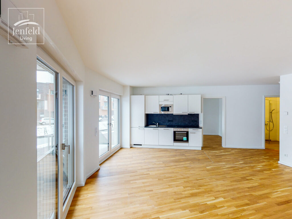 In den Wohnbereichen und Fluren gehen glattweiße Wände mit dem Echtholzparkett eine stilvolle Verbindung ein. Die Küchen sind mit Designvinylboden in Eichenoptik ausgestattet, um eine perfekte Kombination zu bilden. Eine über Fernwärme betriebene Fußbodenheizung sorgt im Winter für wohlige Wärme – und im Sommer mittels Wärmeabführung für angenehm kühle Räume. Die Bäder und WCs erfreuen dank großformatiger Fliesen und moderner Einbauten mit einem puristisch edlen Look. Und natürlich ist jede Wohnung bereits mit einer schicken Einbauküche versehen.