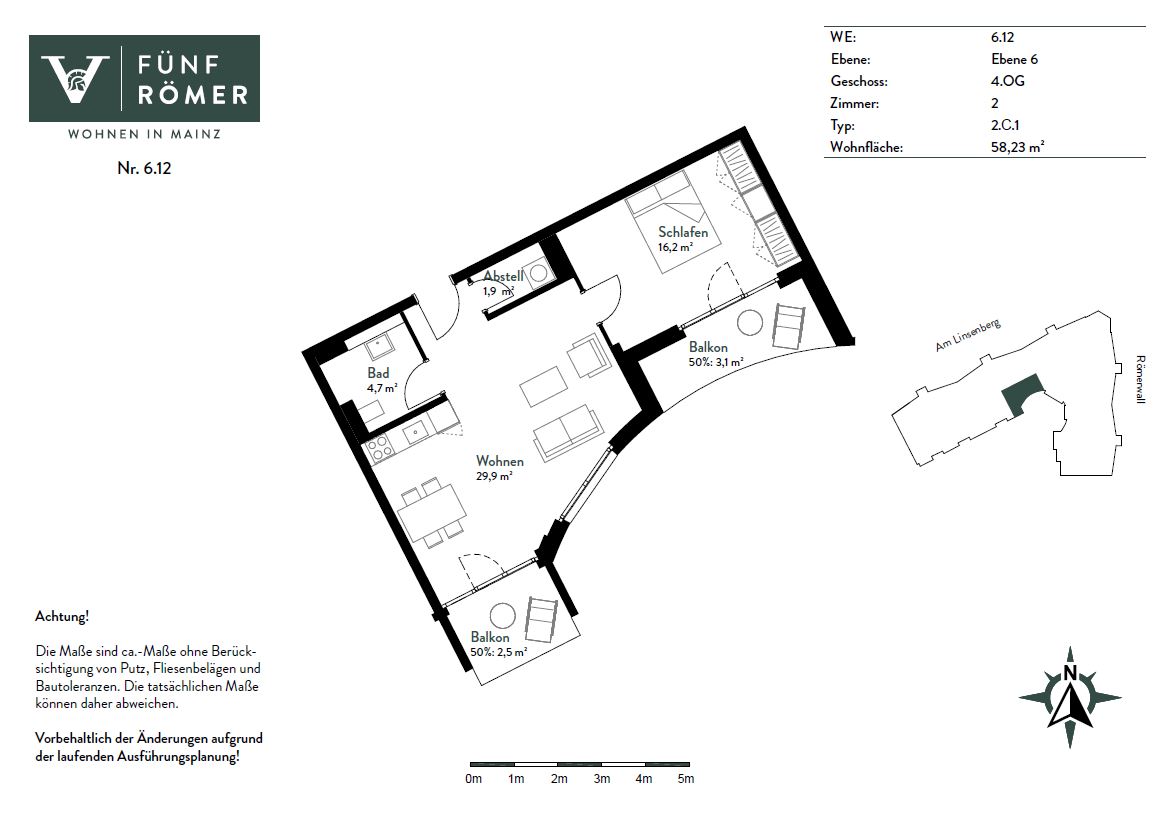Die Wohnanlage FÜNF RÖMER ist Teil eines fünfteiligen Wohnkomplexes, der sich entlang der Straßen Am Linsenberg und Römerwall erstreckt. Auf über 8.000 Quadratmetern Wohnfläche bietet sie 146 modern ausgestattete 1- bis 4-Zimmer-Wohnungen – mit einem besonderen Schwerpunkt auf den begehrten kompakteren Wohnungen.