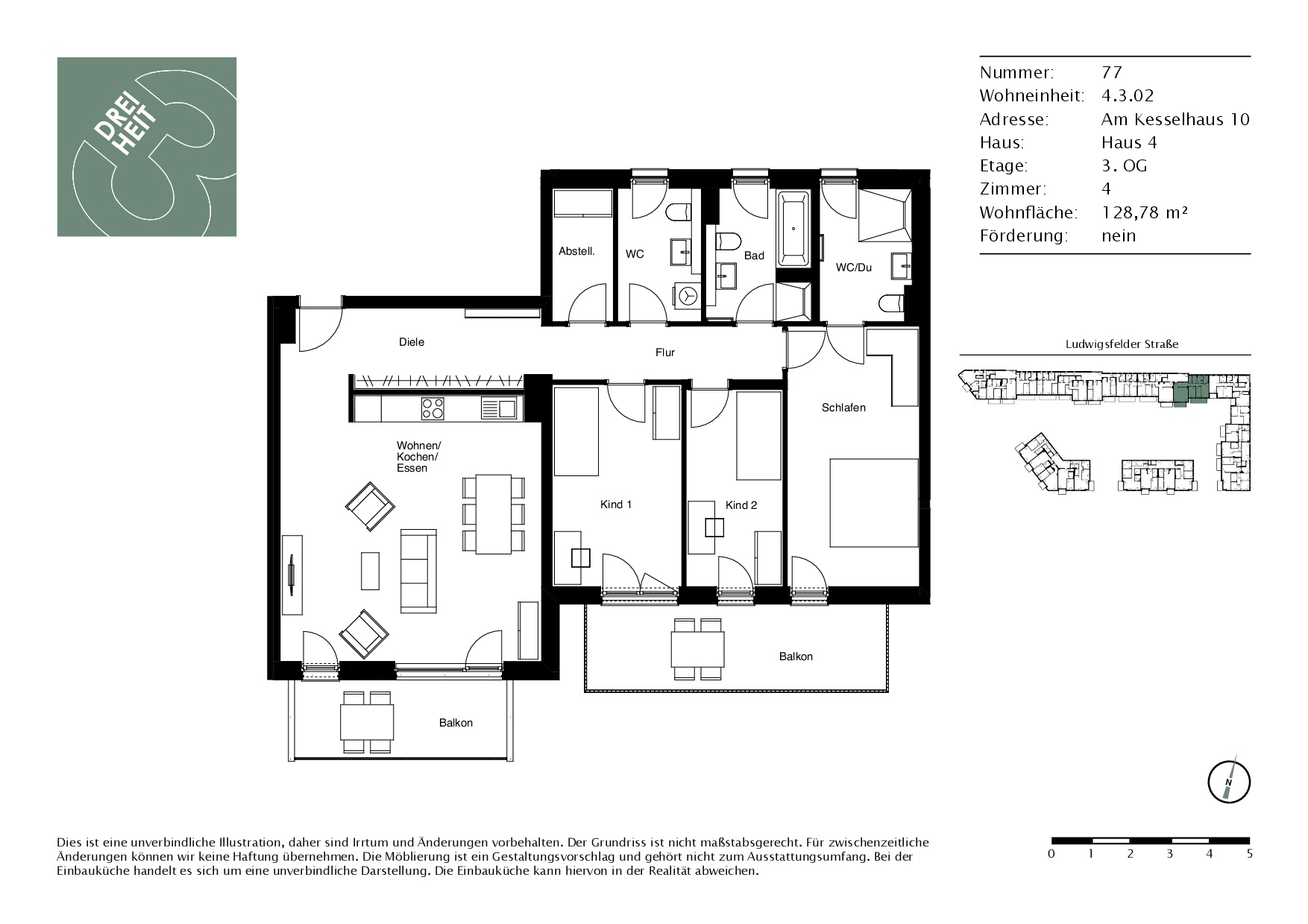 Die Wohnung ist Teil des Projekts DREIHEIT und liegt im Norden des Quartiers DIAMALTPARK. Die hier gezeigte 4-Zimmer-Wohnung ist kompakt geschnitten und komfortabel ausgestattet. Mit einem Elternschlafzimmer und zwei weiteren Zimmern bietet die Wohnung Platz für Kind oder Raum zur individuellen Gestaltung. Im Wohnbereich lassen sich Kochen, Essen und gemeinsame Freizeitgestaltung zur Familienangelegenheit machen. Außerdem begeistern zwei Balkone, ein Abstellraum sowie drei Bäder, von denen eines mit einer Badewanne ausgestattet ist.