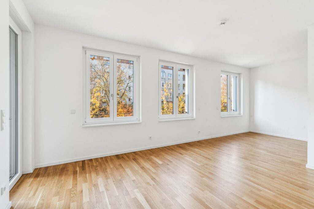 Jede Wohnung begeistert mit einem Balkon, einer Loggia oder Terrasse. Einige der Erdgeschosswohnungen verfügen über einen eigenen Garten. Raumhöhen zwischen 2,72 und 2,90 Metern, teils bodentiefe Fenster und glattweiß tapezierte Wände verleihen den mit Eichenparkett ausgelegten Wohnräumen eine großzügige Ausstrahlung.