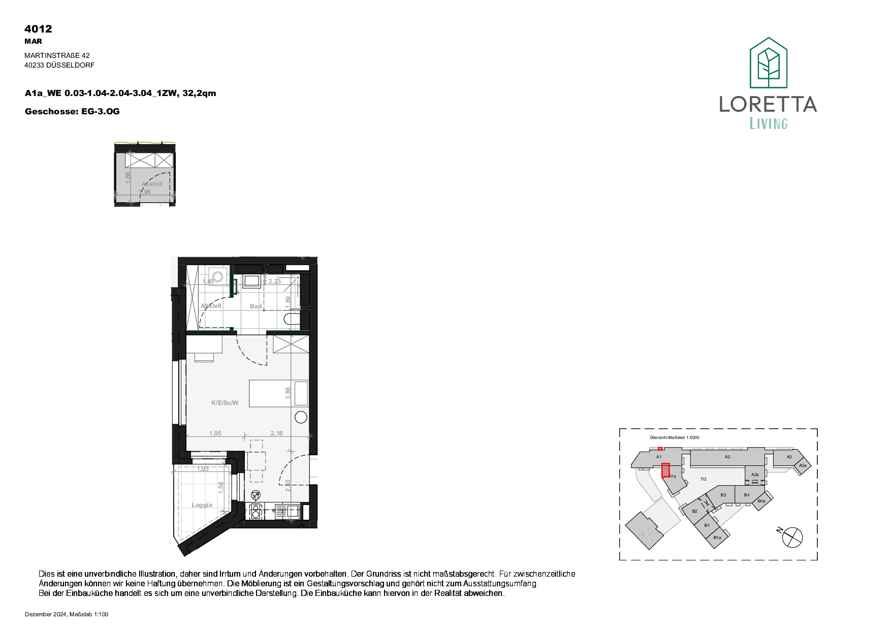 Dieses Apartment bietet eine geschickte Raumaufteilung mit Schlafnische, offener Küchenzeile und direktem Zugang zur Loggia/Terrasse. Ein modernes Duschbad sowie ein funktionaler Abstellbereich sorgen für Komfort im Alltag. Ideal für alle, die modernes Wohnen mit Privatsphäre kombinieren möchten.