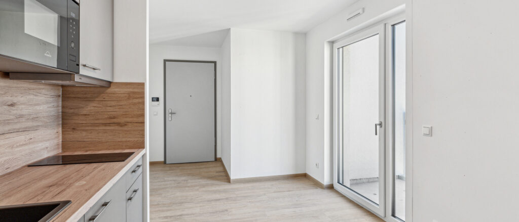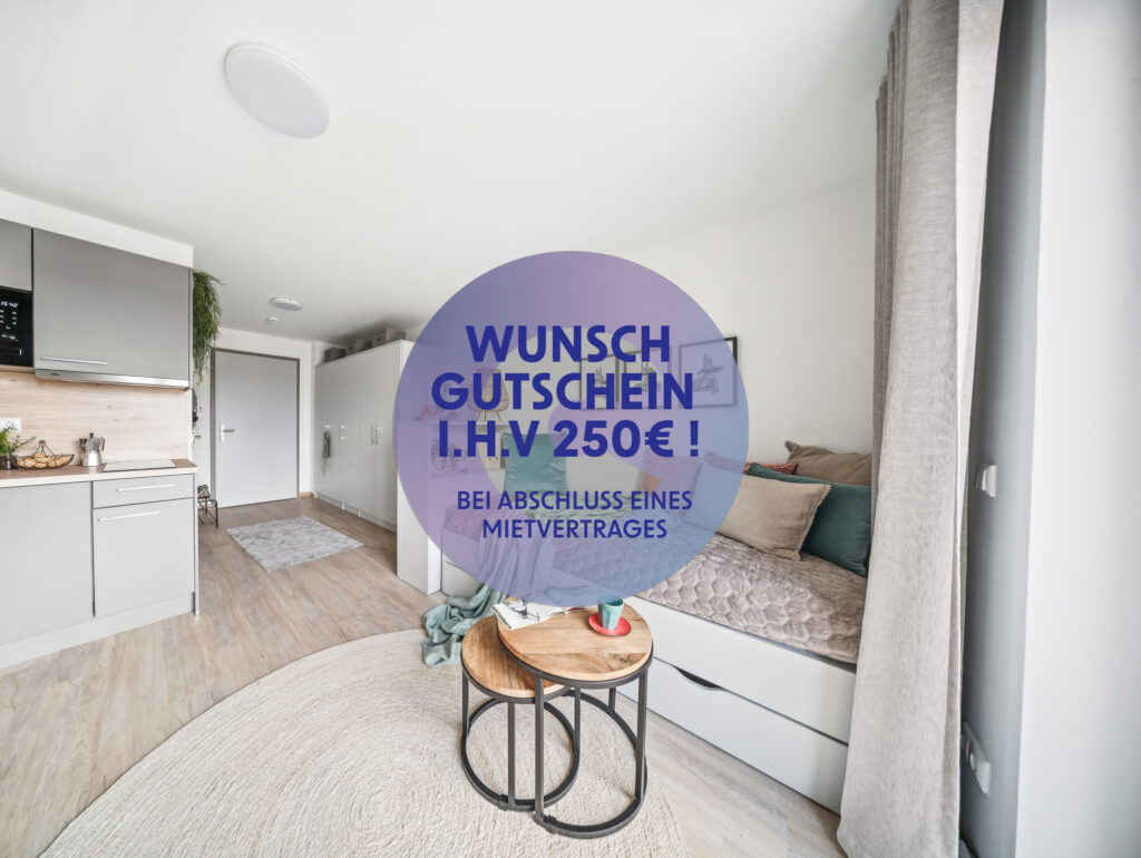 Hier trifft Funktionalität auf Stil: Die Apartments überzeugen durch clevere Grundrisse, hochwertige Materialien und eine zeitgemäße Möblierung bestehend aus Kleider- und Abstellschränken, einem Kastenbett, Regalen bzw. Raumteilern sowie einem Ess-/Schreibtisch. Von lichtdurchfluteten Wohnräumen mit bodentiefen Fenstern bis hin zu Fußbodenheizung und modernen Einbauküchen mit Spüle, Kochfeld, Dunstabzugshaube, Mikrowelle und Kühlschrank ist alles darauf ausgelegt, deinen Alltag so angenehm wie möglich zu gestalten. Einige Wohnungen bieten sogar das Extra einer Terrasse, eines Balkons oder einer Dachterrasse. Neben den Anforderungen an ein KfW-Effizienzhaus 55 (GEG) erfüllt der Neubau auch die Vorschriften des erhöhten Schallschutzes, verfügt über eine effiziente Be- und Entlüftungstechnik, sowie elektrisch betriebene Außenrollos. Die gärtnerische Gestaltung der Gemeinschafts- und Nutzflächen umfasst Rasenanlagen, Baum- und Strauchpflanzungen, Sitzbänke im Freien sowie Stellflächen für Pkw und Fahrradbügel.