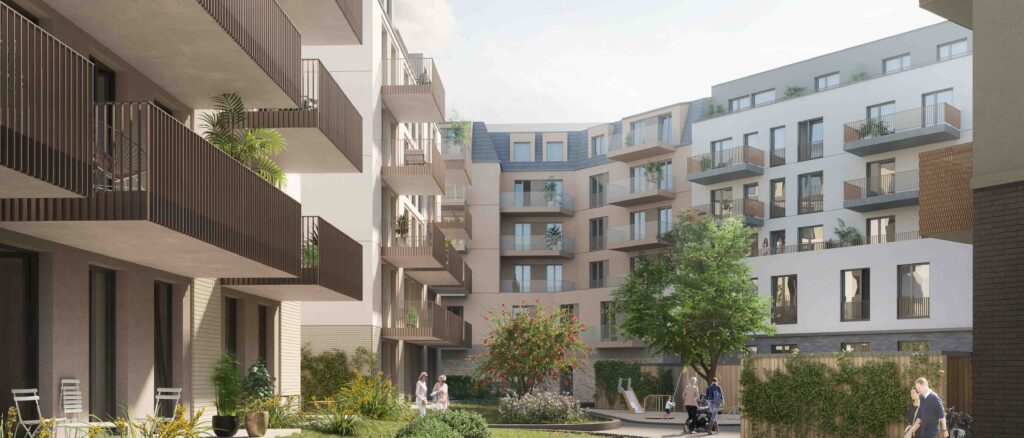 Herzstück der Anlage ist der großzügig begrünte Innenhof, der den Bewohnern zur Verfügung steht. Hier entstehen Aufenthaltsbereiche und Spielflächen für die kleinsten Bewohner, sodass ein lebendiges und familienfreundliches Wohnumfeld entsteht.