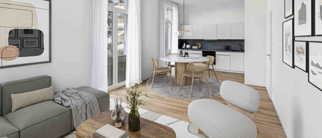 Die Wohnungen verfügen über ansprechende Einbauküchen mit hochwertigen Geräten der Marke Bosch und überzeugen mit hellen, gut geschnittenen Räumen. Nahezu jede Wohnung bietet zusätzlich einen Balkon, Loggia, eine Terrasse oder eine Dachterrasse, die zum Entspannen im Freien einladen.
